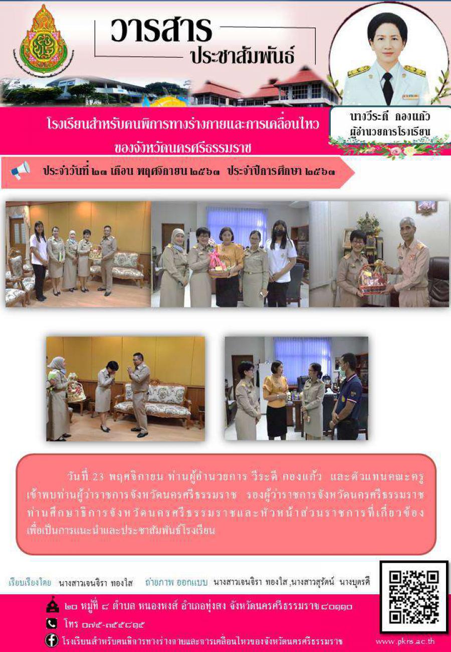 ท่านผู้อำนวยการ วีระดี กองแก้ว และตัวแทนคณะครู เข้าพบท่านผู้ว่าราชการจังหวัดนครศรีธรรมราช รองผู้ว่าราชการจังหวัดนครศรีธรรมราช ท่านศึกษาธิการจังหวัดนครศรีธรรมราชและหัวหน้าส่วนราชการที่เกี่ยวข้อง